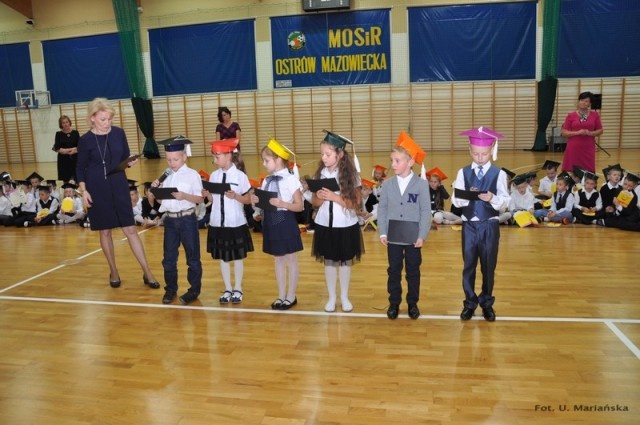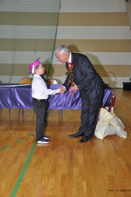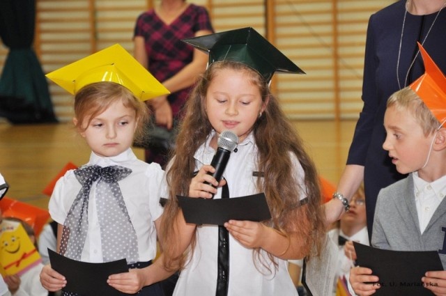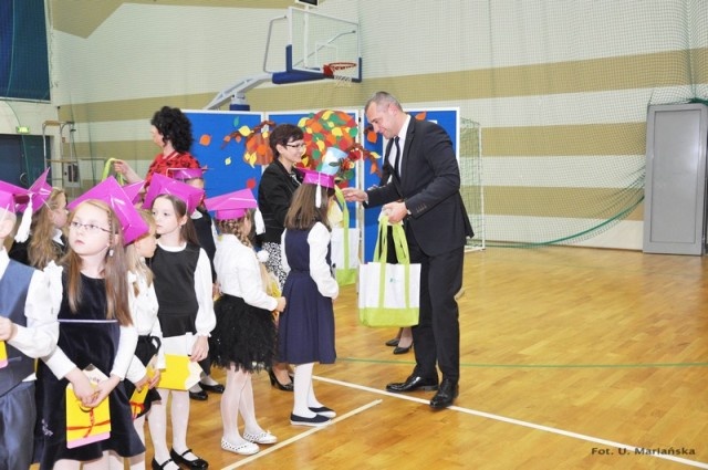 W trakcie swojego święta pierwszaki zostały obdarowane upominkami muzycznymi przez Paulinę Pieniążek z kl. IVc i Amelię Andryszczyk z kl. Vc, pamiątkowymi dyplomami, kolorowymi biretami i rożkami słodkości przez Dyrekcję i Radę Rodziców oraz sprzętem sportowym przez Burmistrza Miasta. Przewodniczący Rady Rodziców, p. Bartosz Kublik, sprawił dzieciom wiele radości swoją niespodzianką. Pozytywnych emocji było wiele, bo pierwszaki były grzeczne i zadowolone z tak pięknego popołudnia, które – jak powiedziała prowadząca Beata Sochocka-Lipska - na długo zostanie w ich pamięci. Teraz, każdego dnia w szkole, będzie drżał już tylko długopis w czasie nauki pisania nowych liter…