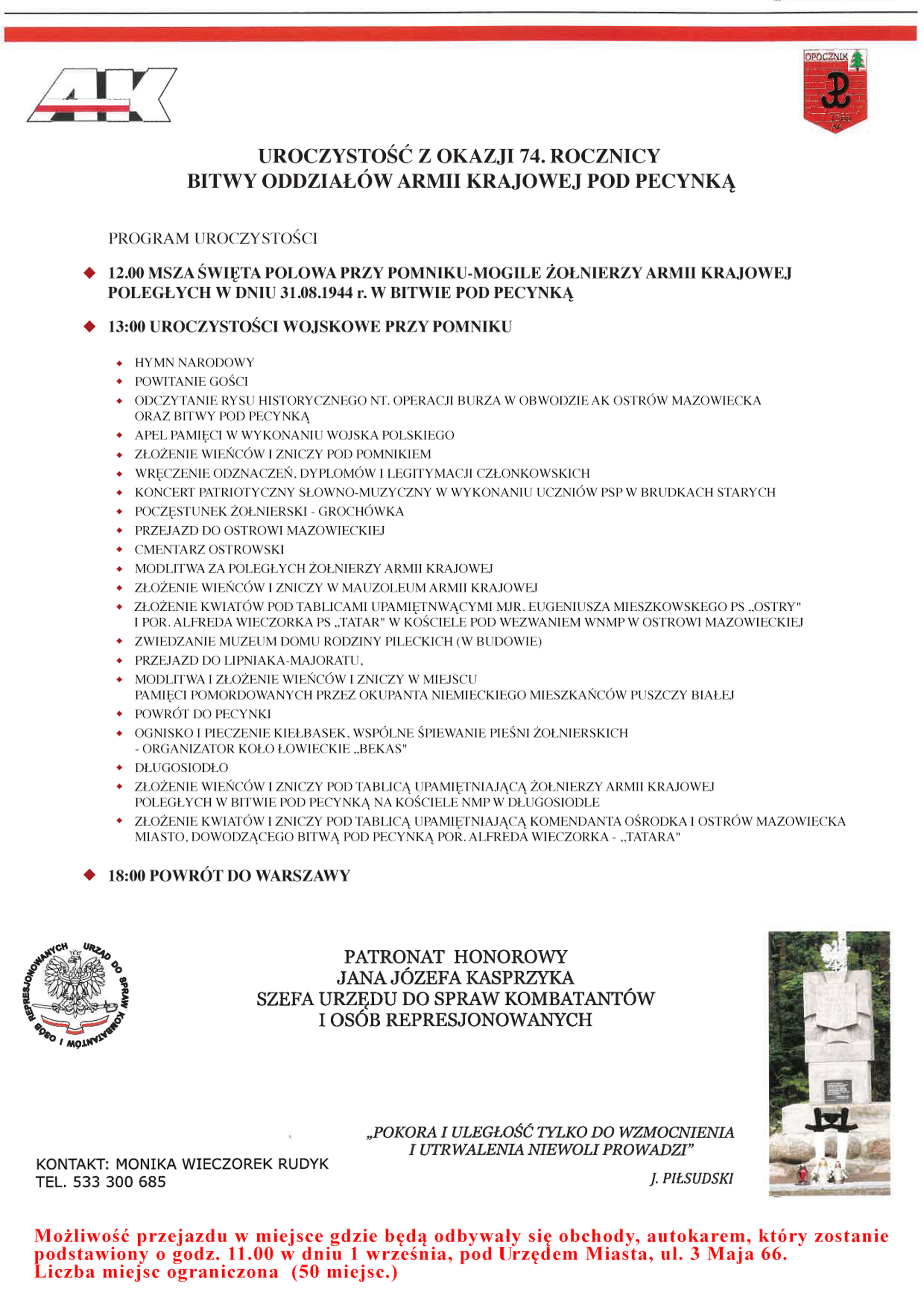 Uroczystość odbędzie się przy pomniku – mogile żołnierzy Armii Krajowej poległych w dniu 31.08.1944 r. pod Pecynką.