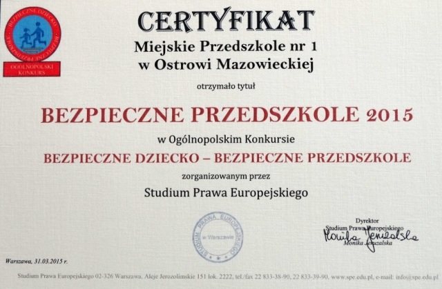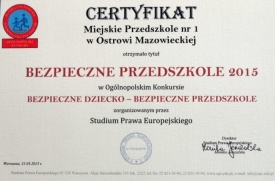 W roku szkolnym 2014/2015 Miejskie Przedszkole Nr 1 w Ostrowi Mazowieckiej przy ul. Batorego16 przystąpiło do Ogólnopolskiego Konkursu „Bezpieczne dziecko - bezpieczne przedszkole” i uzyskało Certyfikat „Bezpieczne Przedszkole 2015”. Celem konkursu było wpojenie dzieciom nawyków bezpieczeństwa w placówkach oraz poza nimi. Konkursowi towarzyszyło studium przedmiotu dla oddelegowanego nauczyciela. Aby otrzymać Certyfikat należało wykonać szereg zadań. Obejmowały one m.in przeprowadzenie cyklu konwersatoriów dla dzieci dotyczących np. pierwszej pomocy, zasad zachowania w sytuacjach zagrożenia, zasad przestrzegania ruchu drogowego, przestrzegania praw dziecka, wzajemnego szacunku, przestrzegania zasad bezpieczeństwa w kontaktach z przyrodą, itp. W przedszkolu odbywały się też spotkania z takimi specjalistami jak lekarz, pielęgniarka, policjant, strażak, leśnik, farmaceuta itp., którzy prowadzili z dziećmi warsztaty lub pogadanki.