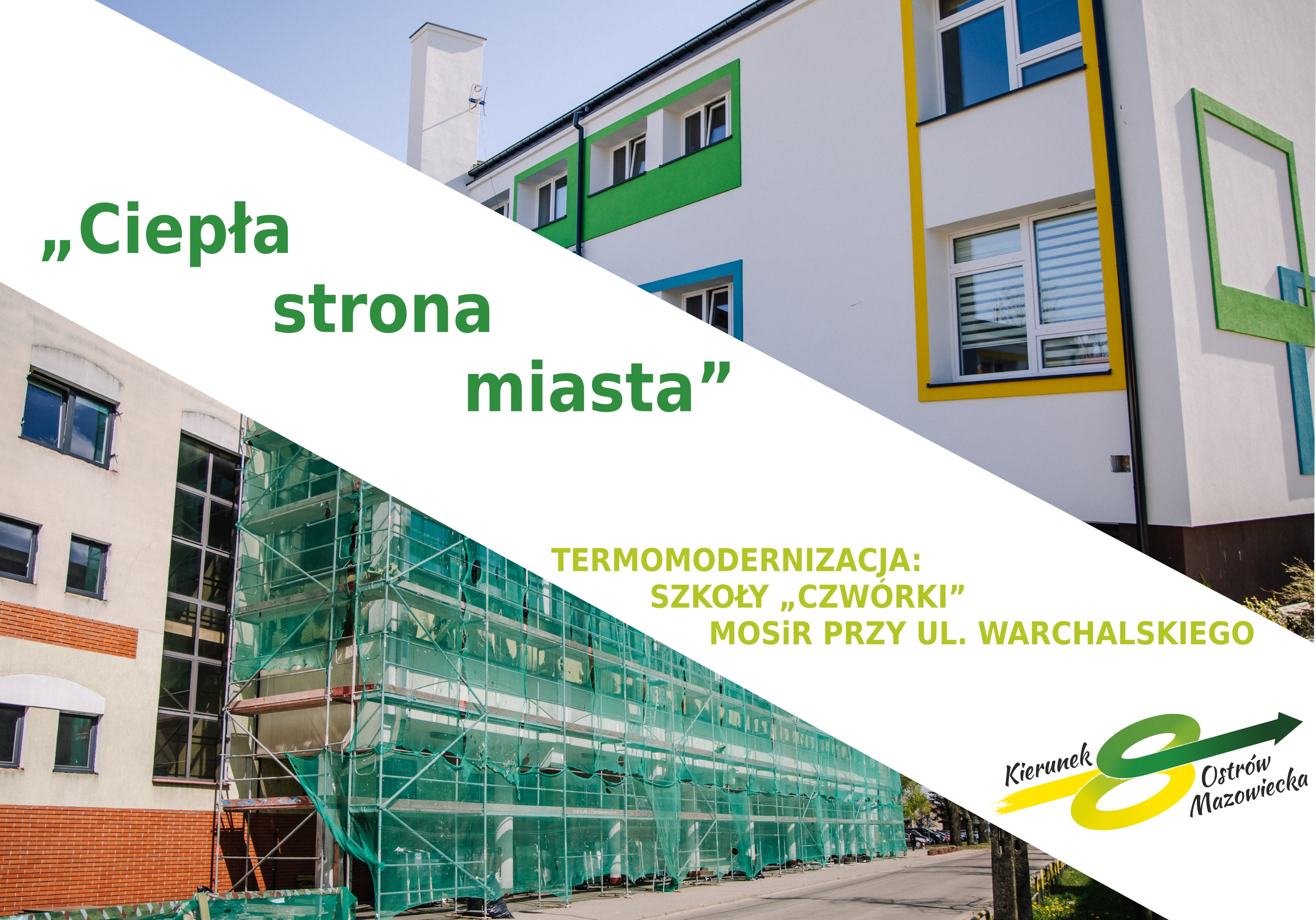 W ramach projektu „Ciepła strona miasta” wykonywane są prace termomodernizacyjne w miejskich obiektach użyteczności publicznej. W Szkole Podstawowej nr 4 przy ul. Szkoły Podchorążych Piechoty prace są na ostatnim etapie realizacji. Budynek zyskał nowym, ciekawszym wyglądem. W połowie kwietnia firma ASIS zaczęła termomodernizację budynku MOSiR przy ulicy Warchalskiego. Termomodernizacja obejmie również budynek Centrum Integracji Społecznej przy ul. Chopina 2B.