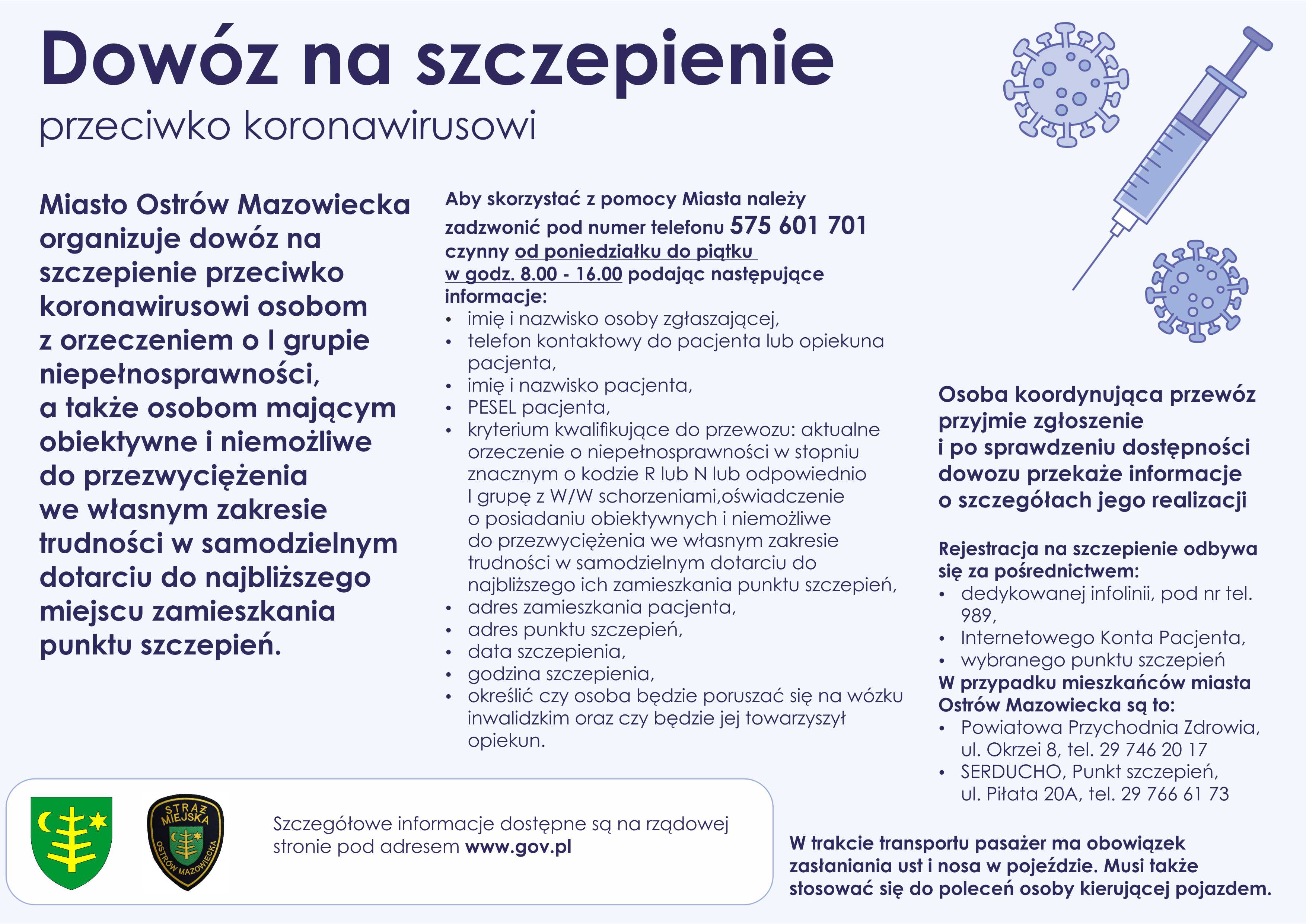 Miasto Ostrów Mazowiecka organizuje dowóz na szczepienie przeciwko koronawirusowi osobom z orzeczeniem o I grupie niepełnosprawności, a także osobom mającym obiektywne i niemożliwe do przezwyciężenia we własnym zakresie trudności w samodzielnym dotarciu do najbliższego miejscu zamieszkania punktu szczepień.