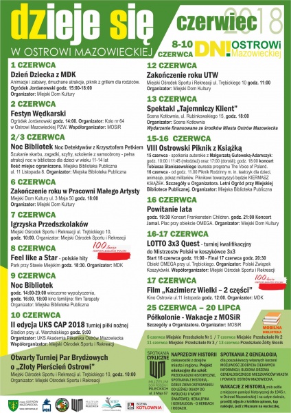 16 czerwca - od godz. 11.00 Piknik Rodzinny m. in. teatrzyk dla dzieci, animacje, pokaz militariów. Piknikowi towarzyszyć będzie KIERMASZ KSIĄŻEK. Szczegóły u Organizatora. Letni Ogród przy Miejskiej Bibliotece Publicznej. Organizator: Miejska Biblioteka Publiczna