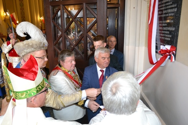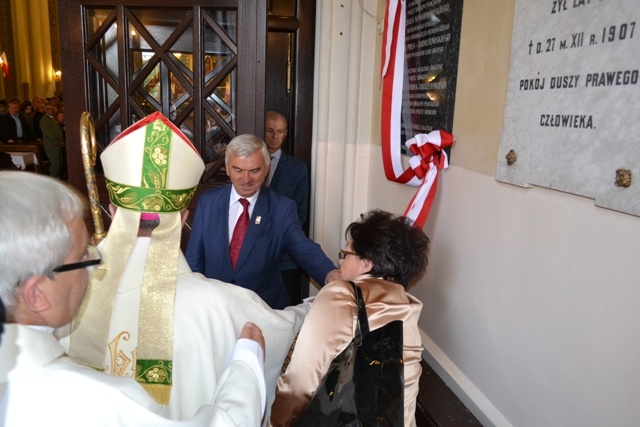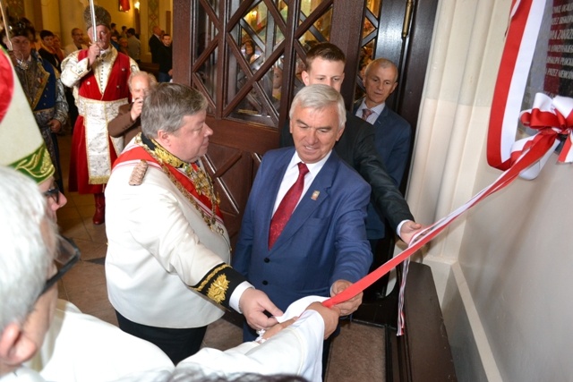Uroczystość rozpoczęła się mszą święta w kościele pw. Wniebowzięcia NMP, pod przewodnictwem Jego Ekscelencji ks. Biskupa Łomżyńskiego dr. Janusza Stepnowskiego. Po mszy biskup Janusz Stepnowski pobłogosławił tablicę pamiątkową, która wisi w kruchcie kościoła. Odsłonięcia wraz z biskupem dokonali: ks. prałat dr Jan Okuła, burmistrz Miasta Władysław Krzyżanowski i Kamil Kisło, przedstawiciel Młodzieżowej Rady Miasta. W trakcie odsłonięcia tablicy konferansjer Remigiusz Danielczyk odczytał treść tablicy pamiątkowej. - W 120. Rocznicę Konsekracji Kościoła pw. Wniebowzięcia nMP w Ostrowi Mazowieckiej przez Biskupa Płockiego Michała Nowodworskiego, wzniesionego staraniem Dziekana i Proboszcza Ostrowskiego Adama Prus- Jarnutowskiego i wielkim wysiłkiem Ludu Bożego. W 70. Rocznicę Ocalenia Świątyni przez Biskupa Pawła Zakrzewskiego, Sufragana Łomżyńskiego późniejszego Biskupa Płockiego od zniszczenia przez Niemców. Wdzięczną pamięć okazują mieszkańcy Miasta Ostrów Mazowiecka. Wrzesień, A.D. 2014.