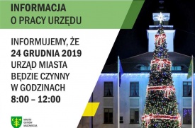 Uprzejmie informujemy, że w dniu 24 grudnia 2019 Urząd Miasta będzie czynny w godzinach: 8:00 – 12:00