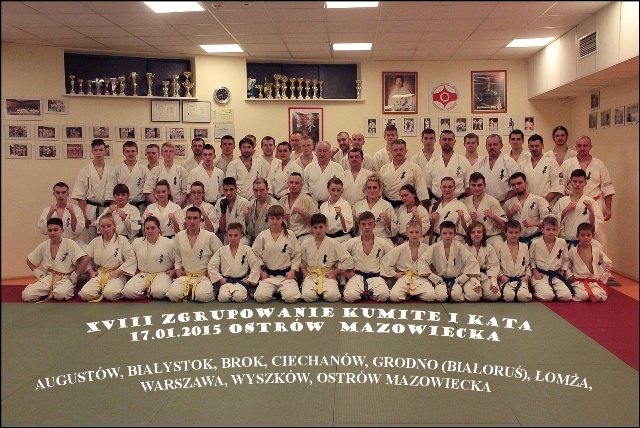 Zgrupowanie kata i kumite odbyło się w naszym klubie w sobotę 17 stycznia. Trening kata poprowadziła sempai Karolina Mroczkowska, utytułowana zawodniczka, podopieczna sensei Dariusza Syrnickiego z Łomży. Trening kata poprowadzono pod kątem zawodników zaawansowanych ( geksaisho ) ale nie zapomniano również o początkujących zawodnikach , którzy doskonalili elementy taikyoku III i pinan I. W tej części treningu wzięło udział 30 zawodników. Tradycyjnie po kata odbył się trening kumite. W dwugodzinnym randori ( walki treningowe ) wzięło udział 60 zawodników. Rozgrzewkę oraz walki seniorów i juniorów poprowadził sensei Rafał Tomala z Warszawy. Osobny trening kumite dzieci przebiegł pod czujnym okiem sensei Tomasza Marcjaniaka. W zgrupowaniu wzięli udział również goście z Grodna na Białorusi. Sensei Igor Markach oraz jego zawodnicy przyjechali razem z ekipą sensei Michała Puczki z Białegostoku. Dziękujemy wszystkim uczestnikom za niezawodne przybycie mimo rozpoczynających się właśnie ferii. W zgrupowaniu uczestniczyli zawodnicy i instruktorzy klubów z Augustowa, Białegostoku, Broku, Ciechanowa, Łomży, Warszawy ( 2 kluby), Wyszkowa i Ostrowi Mazowieckiej.