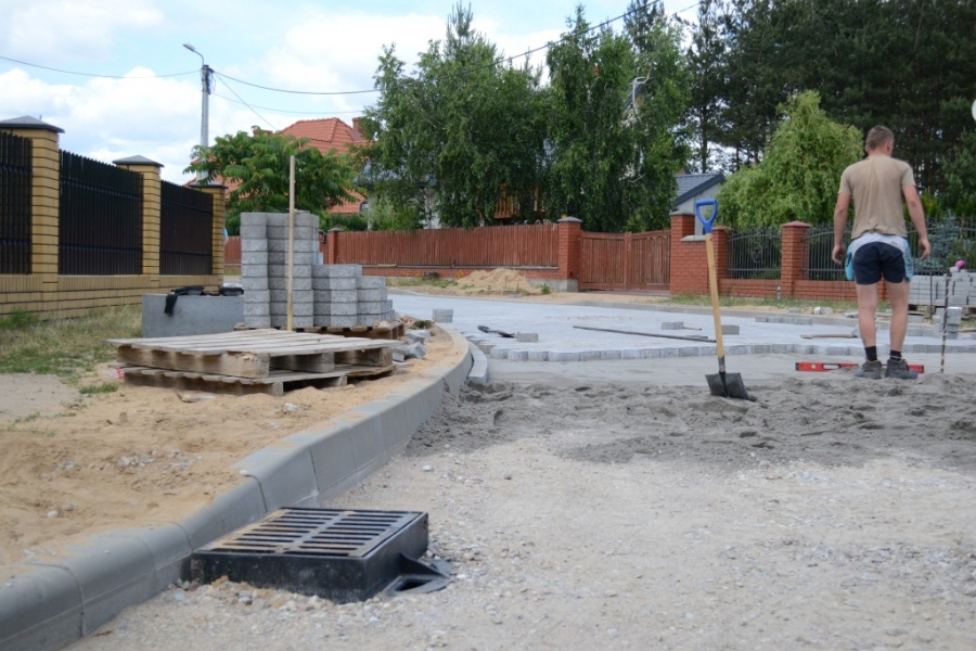 Aktualnie trwają prace związane z utwardzeniem nawierzchni ulicy kostką brukową.