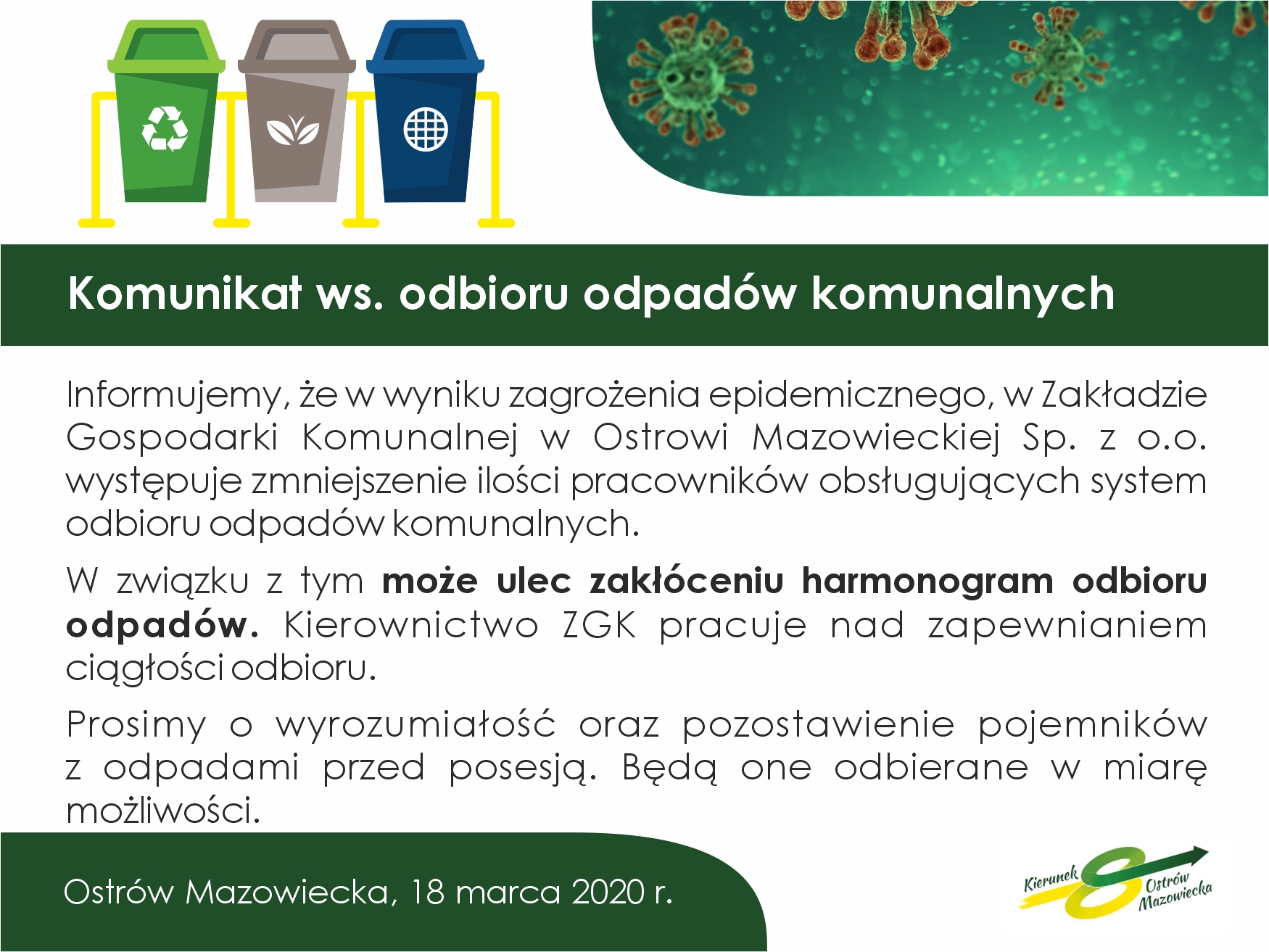 Informujemy, że w wyniku zagrożenia epidemicznego, w Zakładzie Gospodarki Komunalnej występuje zmniejszenie ilości pracowników obsługujących system odbioru odpadów komunalnych.