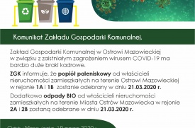 ZGK informuje, że popiół paleniskowy od właścicieli nieruchomości zamieszkałych na terenie Ostrowi Mazowieckiej w rejonie 1 A i rejonie 1B zostanie odebrany w dniu 21.03.2020r.