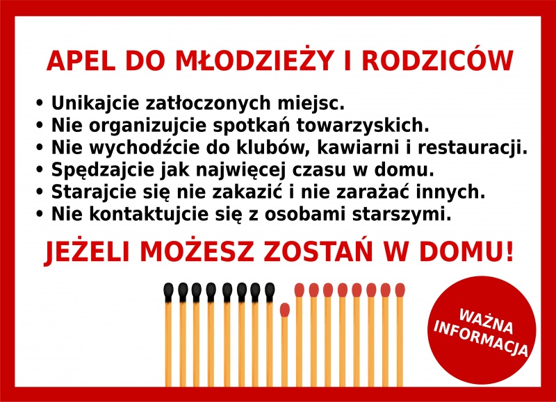 Apelujemy do młodzieży, aby ograniczyła przebywanie w miejscach publicznych. Przez dwa tygodnie nie będziecie chodzili do szkoły ani na uczelnie. To nie są ferie ani czas wolny. Taki błąd popełniono we Włoszech. To jest czas kwarantanny społeczeństwa. Bądźcie odpowiedzialni – to niezwykle ważne!