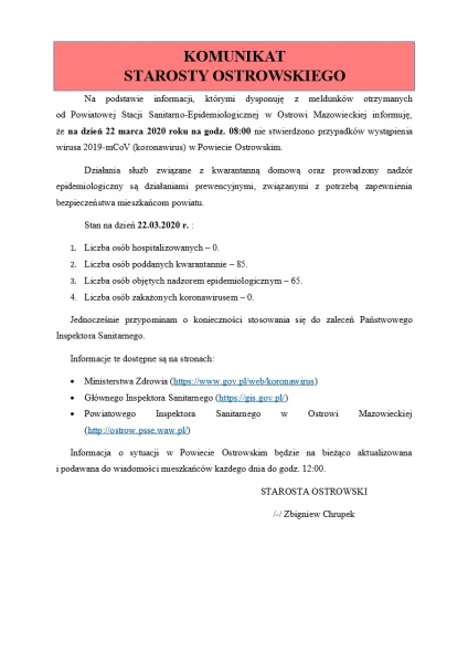 Informacja o sytuacji w Powiecie Ostrowskim dot. koronawirusa.