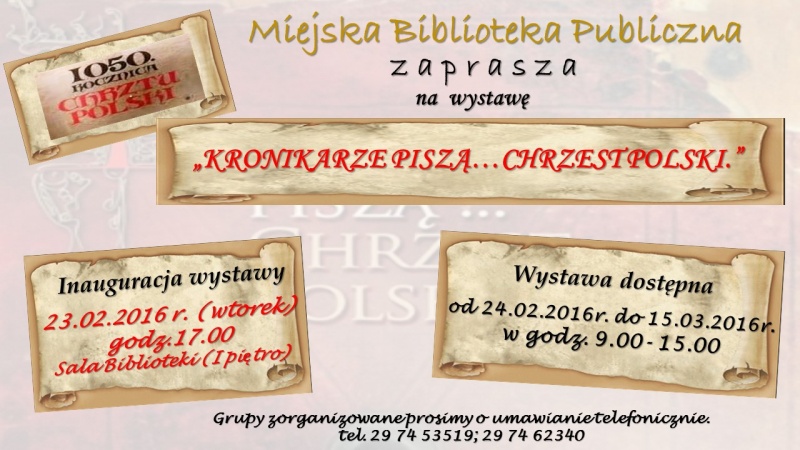 Inauguracja wystawy poświęconej 1050 rocznicy Chrztu Polski, odbędzie się 23 lutego 2016 r., o godz. 17.00 (Sala Biblioteki I piętro). Wystawa dostępna jest od 24 lutego do 15 marca w godzinach 9.00-15.00