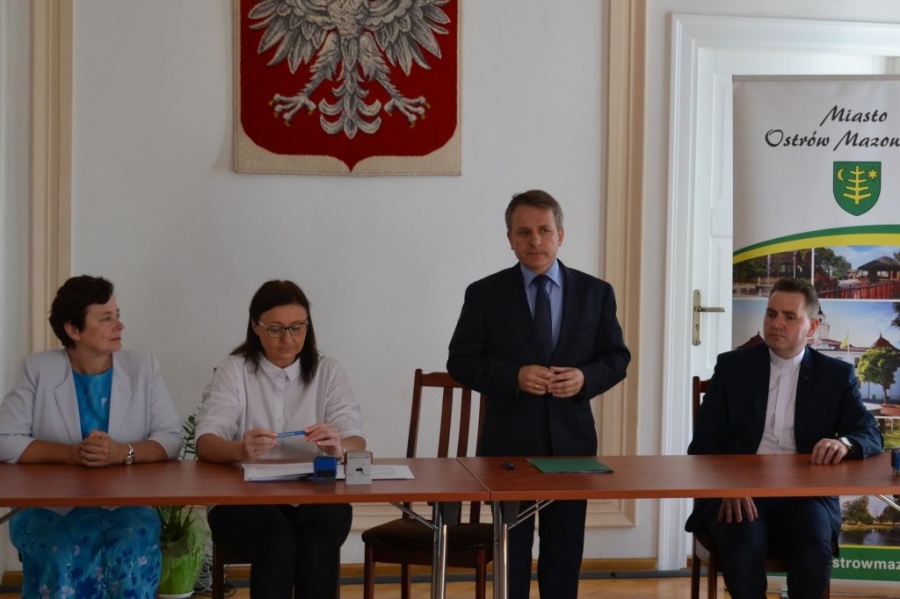 Umowę na prowadzenie Kuchni Miejskiej w Ostrowi Mazowieckiej podpisali 24 czerwca: Dyrektor Caritas Diecezji Łomżyńskiej ks. kan. dr Andrzej Mikucki, Kierownik Miejskiego Ośrodka Pomocy Społecznej Agnieszka Gwardiak oraz Burmistrz Miasta Ostrów Mazowiecka Jerzy Bauer. | Biuro Promocji