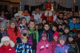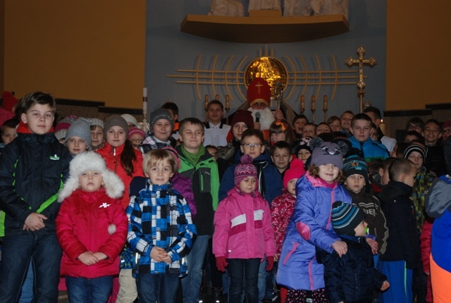 Nie mogło być inaczej, żeby i tym razem, nie zawitał do naszej parafii. Dzień po wspomnieniu jego osoby, w II Niedzielę Adwentu, jako żyw pojawił się jego wysłannik, ubrany odświętnie i w stroju biskupim. Utrudzony podróżą i pracą, chętnie zatrzymał się pośród nas po mszy świętej o godzinie 12.00. Chwila wytchnienia mu się przydała, a czas spędzony w gronie parafialnej dziatwy to istny relaks, zabawa i najlepszy odpoczynek. Pogaduchy z maluchami, śpiew, wierszyki, mnóstwo uśmiechu i radości na obliczach „skrzatów” to żywy Kościół.