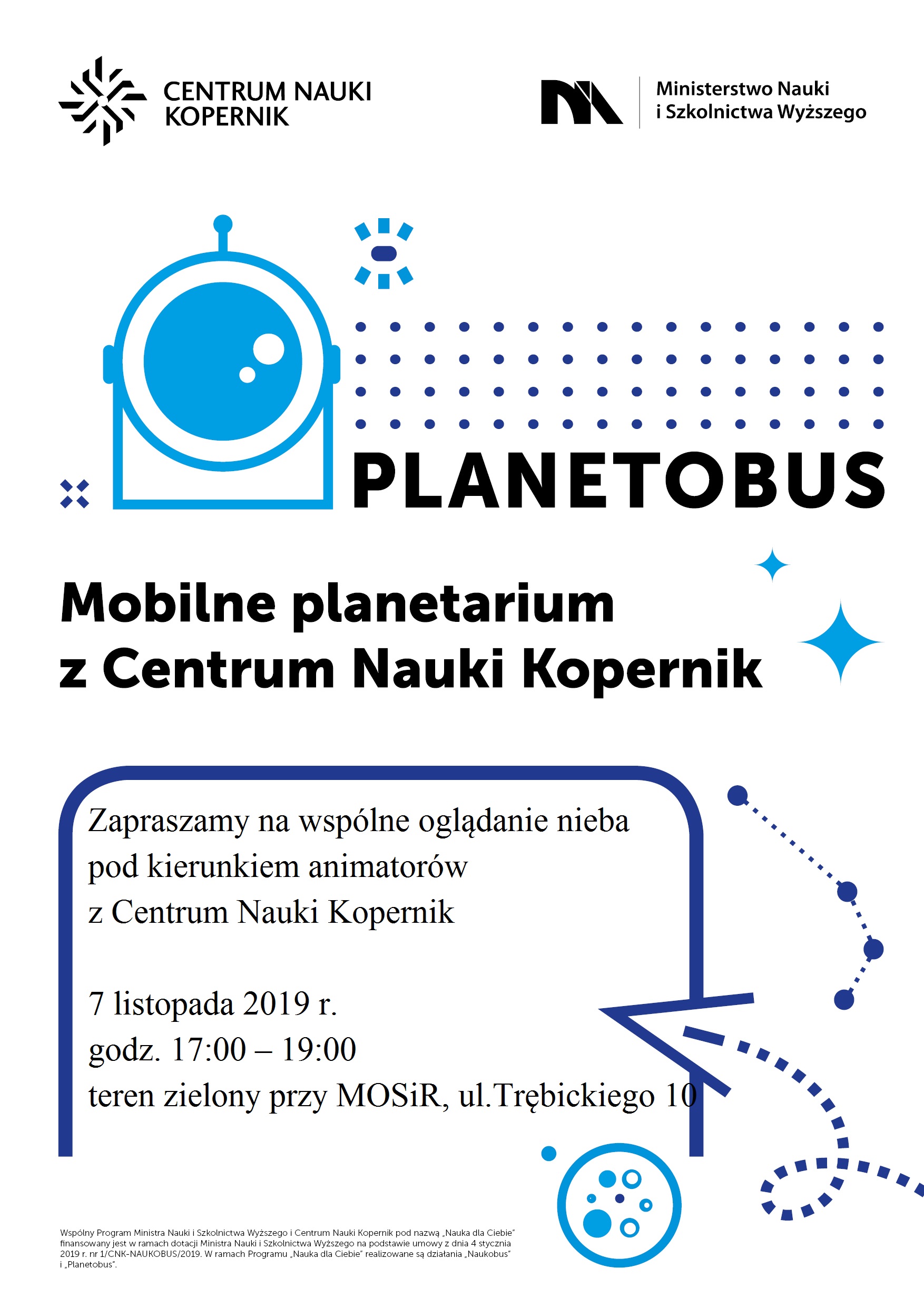 Już w czwartek 7 listopada Planetobus przyjedzie do Szkoły Podstawowej nr 1. Natomiast wieczorem w godzinach 17:00-19:00 zapraszamy mieszkańców miasta na wspólne oglądanie nieba. Warsztaty obserwacji nieba odbędą się na terenie zielonym przy Miejskim Ośrodku Sportu i Rekreacji ul. Trębickiego 10. Animatorzy z Centrum Nauki Kopernik przy pomocy lornetek i teleskopu pomogą znaleźć na niebie Saturn i jego pierścienie. Razem postaramy się odszukać typowo jesienne gwiazdozbiory: Pegaz, Andromedę, Perseusza, oraz całoroczne – Wielką i Małą Niedźwiedzicę oraz Kasjopeję. Zapraszamy!