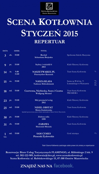 Dla osób chętnych Scena Kotłownia organizuje wyjazd na sztukę „Nasza Klasa” do warszawskiego Teatru na Woli im. Tadeusza Łomnickiego, a w miesiącu lutym na Scenie Kotłownia będzie można usłyszeć żydowskie piosenki. Klub Filmowy Kotłownia zaprasza na trzy filmy: „Szybcy i wściekli 6”, „Mój przyjaciel wróg” i „Zielona Mila”.