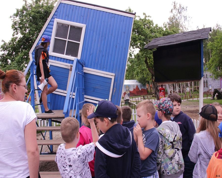1 czerwca w Międzynarodowy Dzień Dziecka, uczniowie klasy drugiej z ostrowskiej ,,Czwórki” wraz z nauczycielkami Anną Grabowską i Marią Kowalską wyjechali na wycieczkę do Mościsk koło Trojanowa. Celem podróży był Park Edukacji i Rozrywki, w którym uczniowie mogli się bawić, ale też uczyć. Na Farmie Iluzji można było dostrzec wiele niesamowitych budowli, gigantyczne zabawki oraz miejsca pełne magii. Najwięcej wrażeń wywołał Labirynt Luster i Tunel Zapomnienia, jednak wiele emocji wzbudził u uczniów Zakręcony Domek. Ciekawym przeżyciem było wejście do Pokoju Amesa oraz do Latającej Chaty Tajemnic. Na Farmie dzieci mogły obcować z iluzyjnymi eksponatami typu: magiczny domek, lewitujący kran z którego woda płynie ,,do góry” chociaż nigdzie nie jest podłączony. Dodatkowo można było do woli bawić się na placu linowym, drewnianym placu zabaw, pojechać kolejką torową na Dziki Zachód. Na trampolinie wykazywały się wprost niespożytą energią. Obejrzały "Meble Olbrzyma" w skali 4:1. W "Latającej Chacie" mogły przekonać się, co się dzieje, gdy podłoga jest pod kątem, a ściany mają prostą tapetę. Miały okazję puścić piłeczki, które turlały się "odwrotnie" do prawa grawitacji. W "Muzeum Iluzji" dzieci mogły bliżej poznawać zjawisko złudzenia optycznego na przykładzie krzywych zwierciadeł oraz różnego rodzaju hologramów. W "Tunelu Zapomnienia" odważni mogli spróbować przejść po ciemku wśród wirujących świateł - prawdziwa sztuka, aby nie stracić równowagi. Wśród eksponatów do aktywnej zabawy dzieci próbowały także zmierzyć się z powietrznymi strumieniami i umieścić na nich piłeczki oraz dać położyć swoją głowę na patelni. Bawiły się w poszukiwaczy przygód w Wiklinowym Labiryncie - były pełne energii i bez trudu przebiegły labirynt. Odwiedziły mini-zoo, gdzie podziwiały różne króliczki i kucyka Czarusia.W drodze powrotnej zajechaliśmy na posiłek do Mc Donalds. Wycieczka odbyła się dzięki wsparciu rodziców w opiece nad dziećmi. To była wspaniała wyprawa, z której przywieźliśmy pamiątki, zdjęcia i bardzo miłe wspomnienia. Pełni niesamowitych przeżyć wróciliśmy ok.17.00 do szkoły, gdzie czekali stęsknieni rodzice.