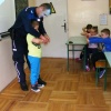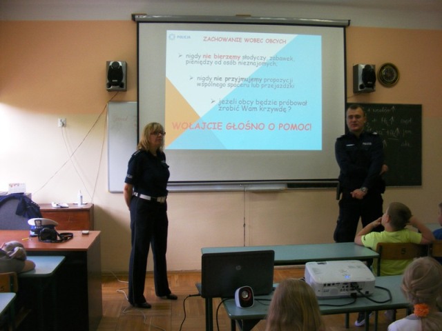 3 września br., policjanci z Komendy Powiatowej Policji w Ostrowi Mazowieckiej odwiedzili najmłodsze dzieci ostrowskiej „Czwórki”. Tego dnia naszą szkołę odwiedziła Naczelnik Wydziału Ruchu Drogowego Komendy Powiatowej Policji nadkom. Ewa Dmochowska i sierżant sztabowy Marcin Leszczyński zajmujący się na co dzień sprawami nieletnich i patologii. Policjanci przypomnieli najmłodszym podstawowe zasady bezpieczeństwa podczas poruszania się po drogach, zasady ograniczonego zaufania w stosunku do obcych. Przekazali również dzieciom jakie niebezpieczeństwa mogą na nich czyhać na drodze, w domu podczas nieobecności rodziców oraz jak zachować się podczas ataku psa. Uczniowie przypomnieli sobie zasady przechodzenia przez jezdnię, podróżowania samochodem oraz jazdy rowerem. Dzieci bardzo chętnie odpowiadały na zadawane pytania i podawały liczne przykłady niewłaściwego zachowania się. Policjanci uczulili także uczniów, aby zawsze pamiętali o zapinaniu pasów podczas podróży samochodem. Przypomnieli również o korzyściach noszenia elementów odblaskowych przy ubraniu bądź tornistrze. Na pamiątkę spotkania z policjantami wszystkie pierwszaki otrzymały odblaski i dyplomy. Niespodzianką dla wszystkich uczniów były odwiedziny liska – policyjnej maskotki.