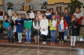 Ci nieco młodsi, dzieci ze Szkoły Podstawowej w Dudach, także chcieli oddać hołd świętemu papieżowi. Przygotowali pod okiem pani katechetki Aldony montaż słowno – muzyczny i wystawili go w kościele parafialnym po mszy południowej. Dla nich było to wielkim wyzwaniem, mając przed sobą spore audytorium obcych im ludzi, ale też i wsparcie patrzących oczu i gorąco bijących serc mamuś czy tatusiów. Dało się czasem wyczuć w ich recytacjach wierszy czy śpiewie pieśni i piosenek, dreszczyk emocji, niepewności i chęci jak najlepszego zaprezentowania się. Nie mają te dzieci możliwości, by, na co dzień prezentować się na estradach, ale za to mają wielką odwagę, radość życia i wiele talentów, którymi się dzielili i wielbili Boga.