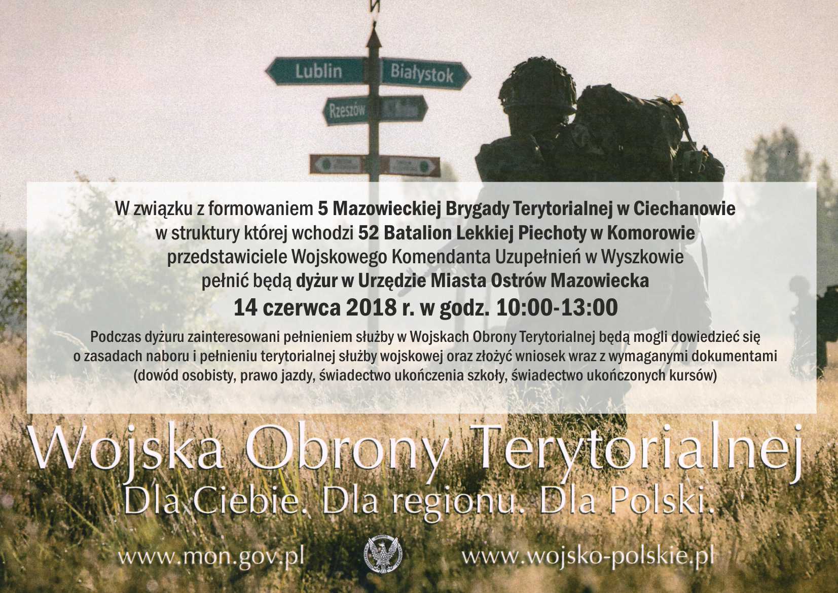 W związku z formowaniem 5 Mazowieckiej Brygady Terytorialnej w Ciechanowie w struktury której wchodzi 52 Batalion Lekkiej Piechoty w Komorowie przedstawiciele Wojskowego Komendanta Uzupełnień w Wyszkowie pełnić będą dyżur w Urzędzie Miasta Ostrów Mazowiecka 14 czerwca 2018 r. w godz. 10:00-13:00.