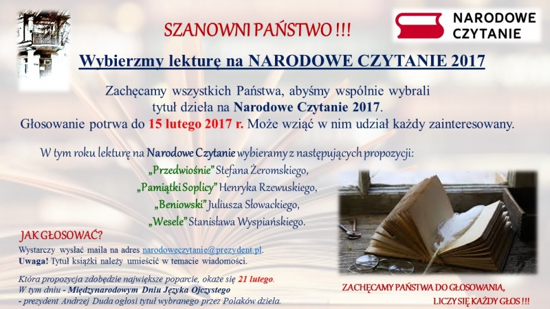 Na początku września 2017 roku odbędzie się kolejna edycja Narodowego Czytania. Prezydent RP Andrzej Duda zaproponował, aby lekturę na to spotkanie wybrali Polacy.