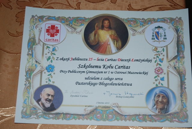 Swoją cegiełkę do tego wysiłku dostawia również młodzież ostrowska ze SKC przy Gimnazjum Publicznym nr 1. Na ponad trzynaście tysięcy młodzieży zrzeszonej w SKC diecezji znaczny odsetek stanowi młodzież z naszego miasta. Ich otwarta wola, chęć niesienia pomocy, zaprzęgnięcie się w powożeniu dobra, poświęcony czas i dawanie siebie innym, zostały zauważone i docenione przez Caritas Diecezji Łomżyńskiej. Ojciec Święty Franciszek wszystkim wolontariuszom przesłał swoje błogosławieństwo, które pasterz naszej diecezji ks. bp Janusz Stepnowski powielił i przekuł na papier, udzielając go wszystkim wolontariuszom, a w szczególności wybranym przedstawicielom Parafialnych i Szkolnych Kół Caritas. Obok nich docenieni zostali też opiekunowie, asystenci kościelni i ludzie dobrej woli, którzy się poświęcają i opiekują młodzieżą działającą w kołach.